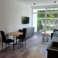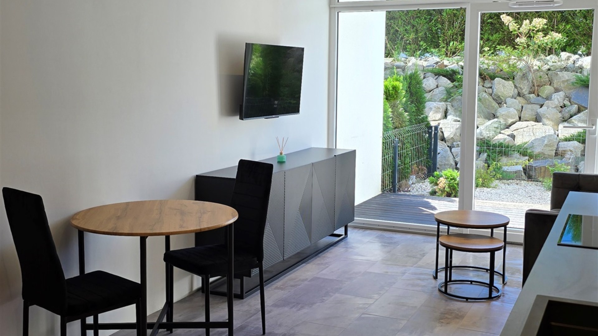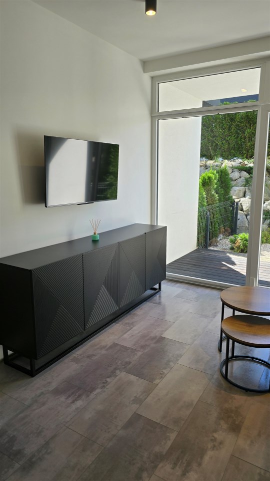 Przestrzeń otwarta, nowoczesna, z dużymi oknami prowadzącymi na ogródek. Jasne wnętrze sprzyja wypoczynkowi, pracy oraz wygodnemu gotowaniu. Ogródek idealny na poranną kawę lub wieczorny relaks z widokiem na góry.