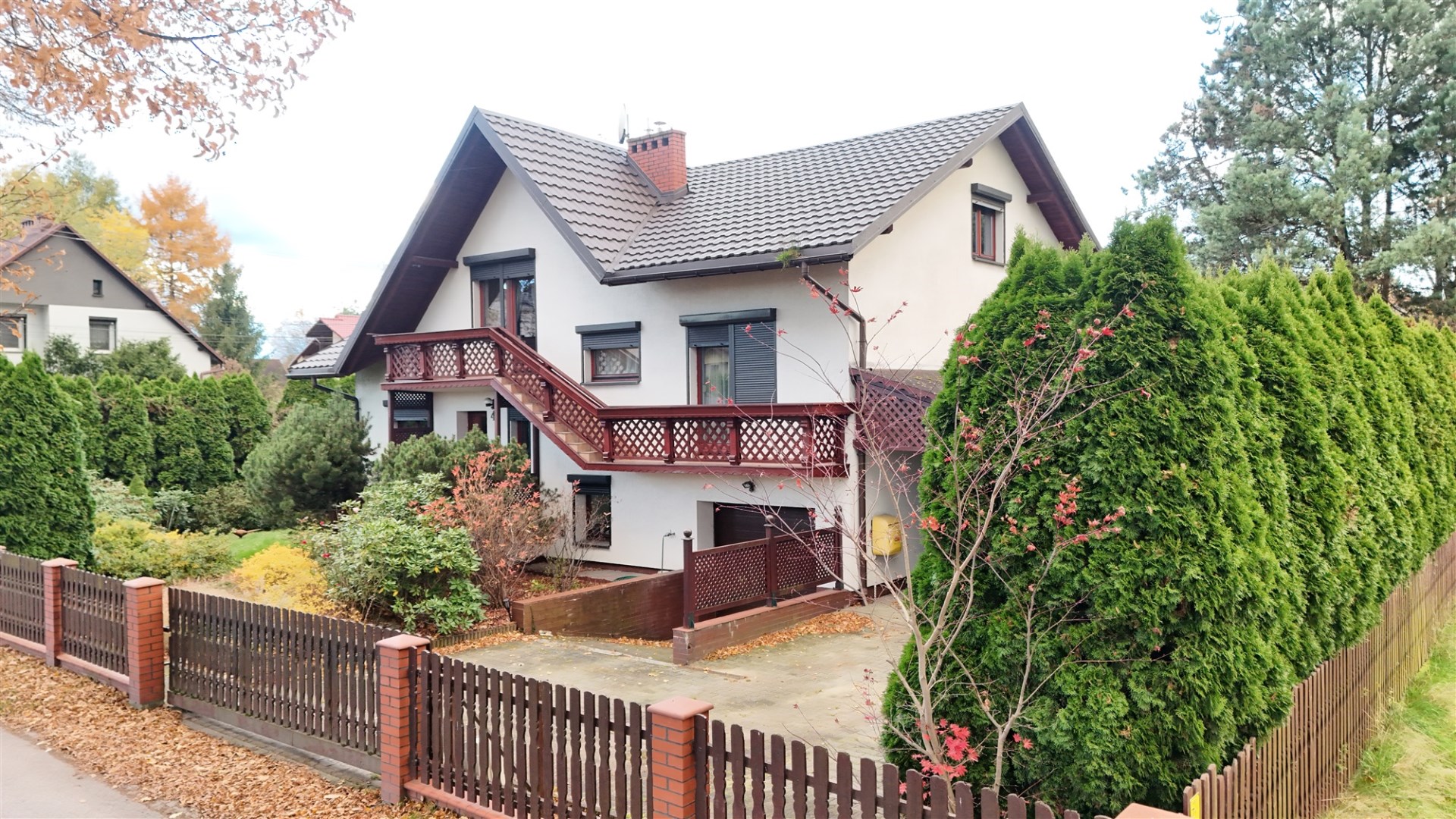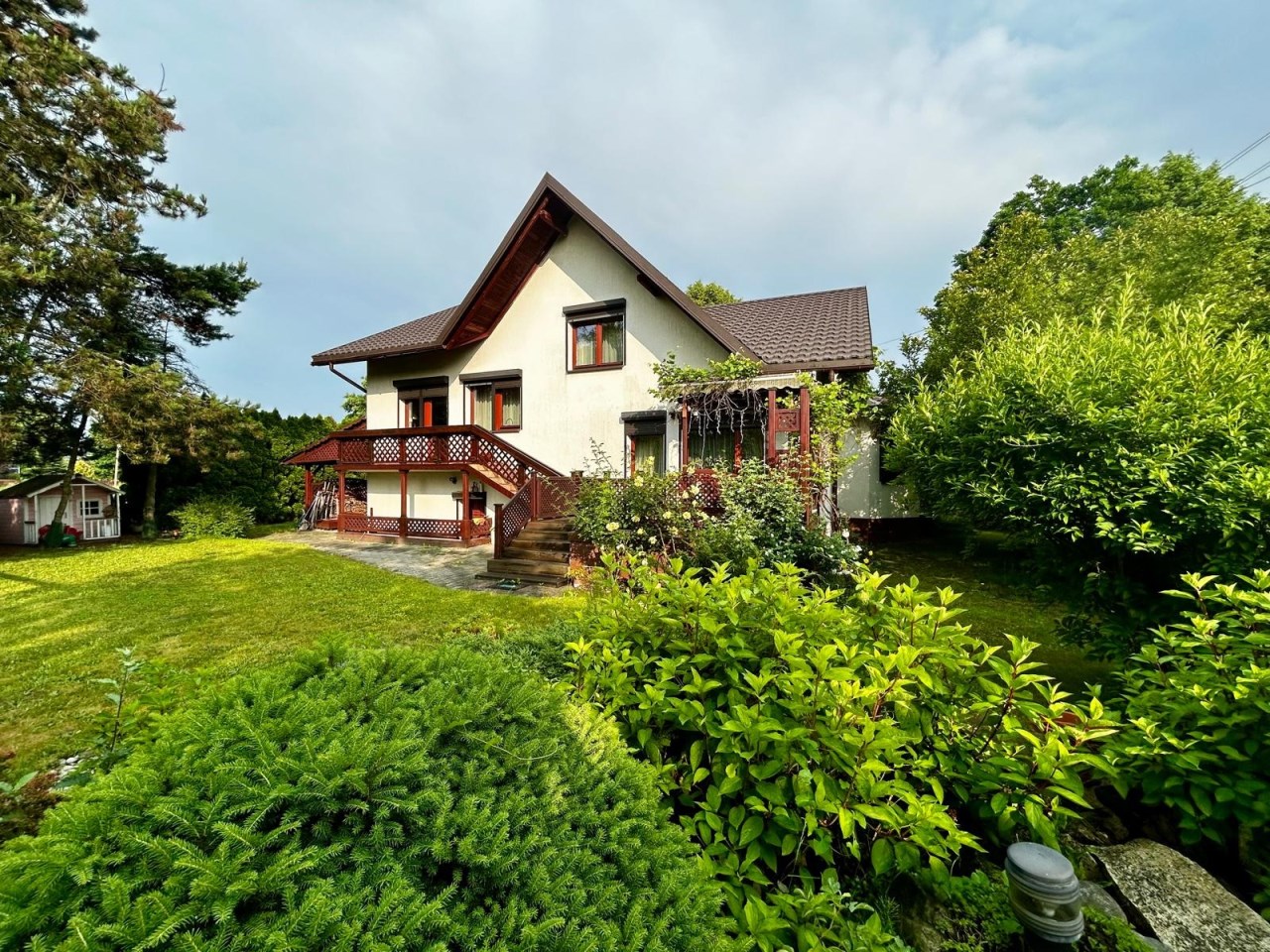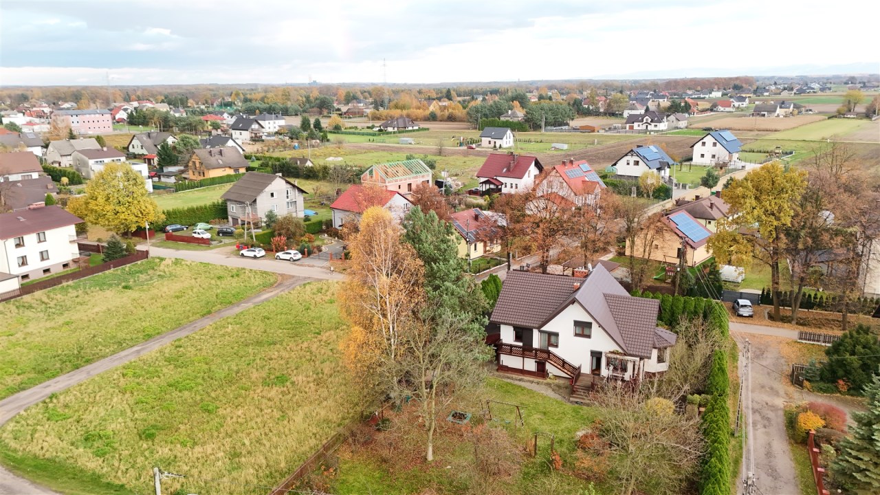 Nieruchomość składa się z dwóch działek ewidencyjnych – jedna zabudowana domem, druga stanowiąca ogród z osobnym wjazdem. Ogród jest w pełni zagospodarowany – znajdują się w nim ozdobne nasadzenia oraz krzewy owocowe. Możliwość niezależnego wykorzystania drugiej działki stanowi dodatkowy atut oferty.