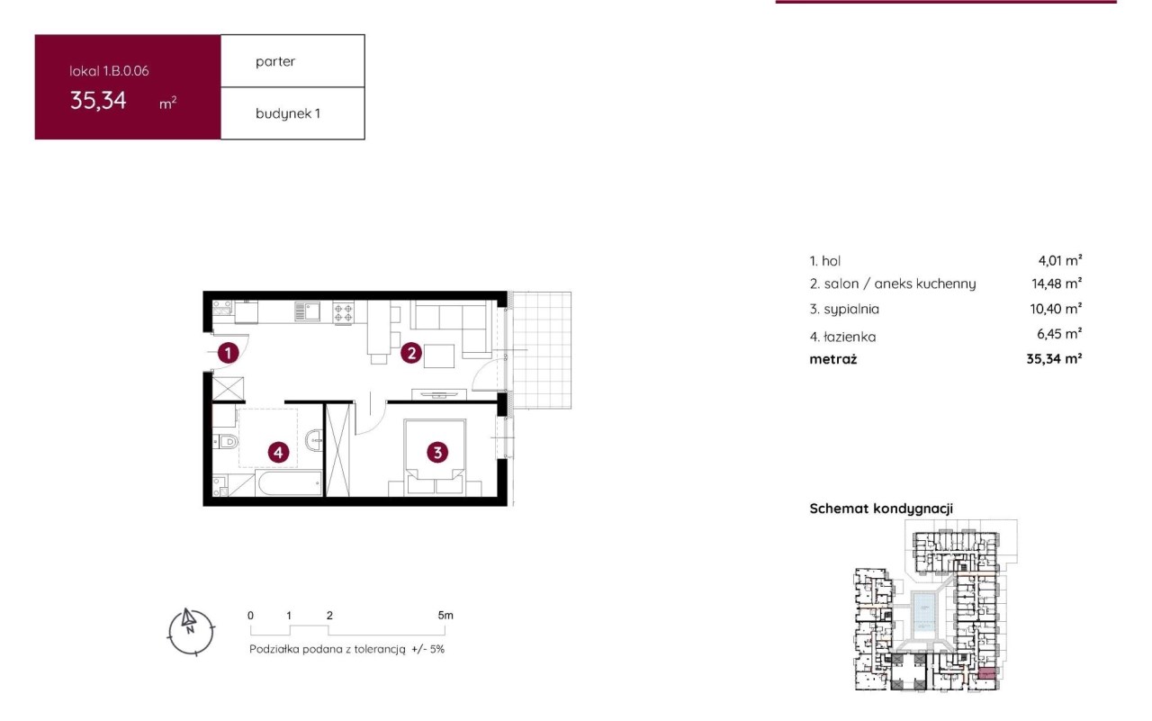 Mieszkanie posiada funkcjonalny układ obejmujący salon z aneksem kuchennym, sypialnię, łazienkę oraz hol. Prywatny ogródek o powierzchni około 15 m² stanowi rzadko spotykany atut w inwestycjach zlokalizowanych w centrum miasta i daje dodatkową przestrzeń do wypoczynku lub aranżacji zielonej strefy relaksu.