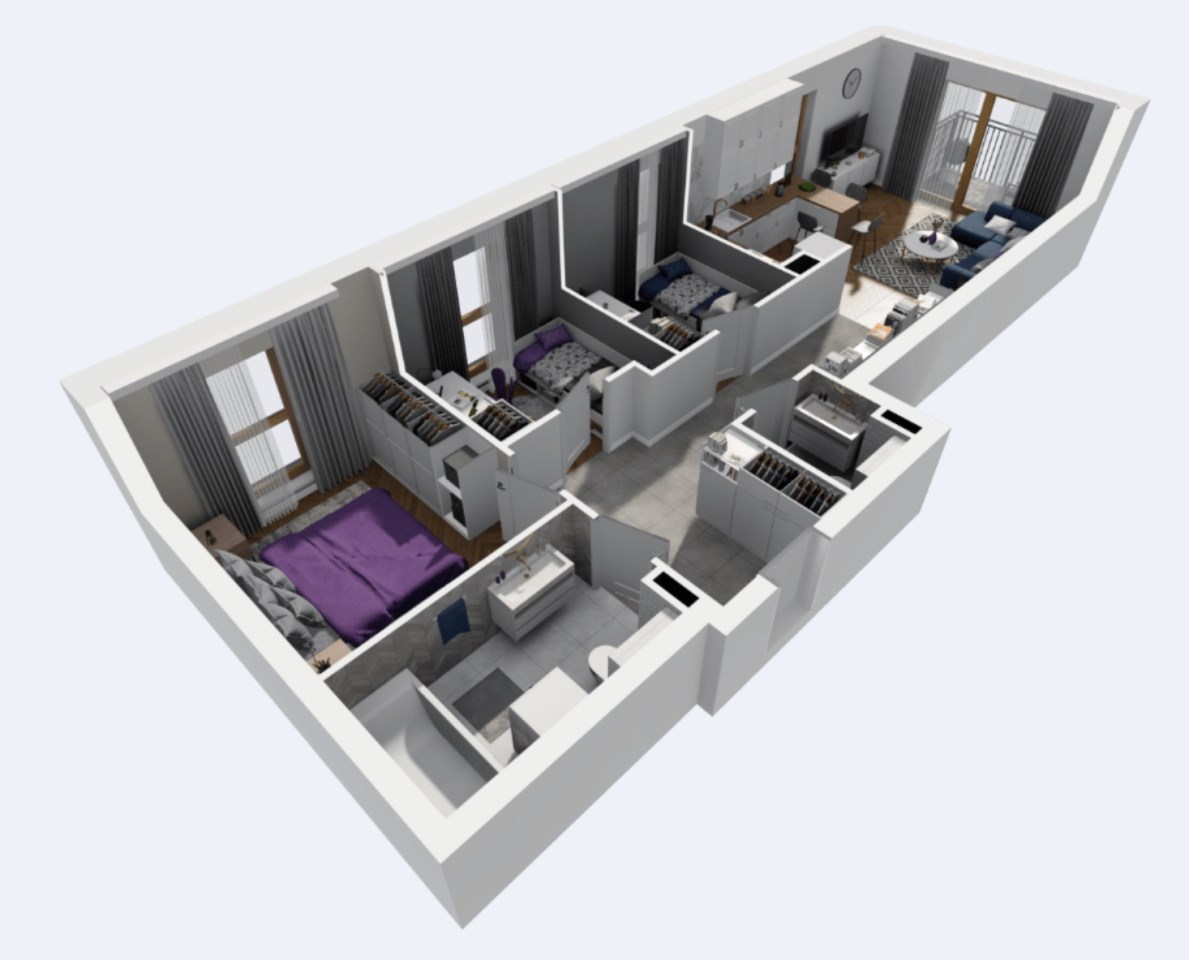 Możliwość powiększenia głównej sypialni – wystarczy przekształcić jeden z pokoi w garderobę lub dodatkową część sypialnianą