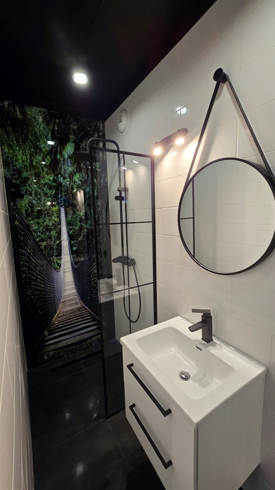 Wykończona w wysokim standardzie, wyposażona w pralkę oraz elegancką armaturę.