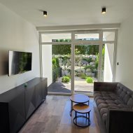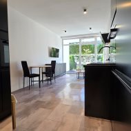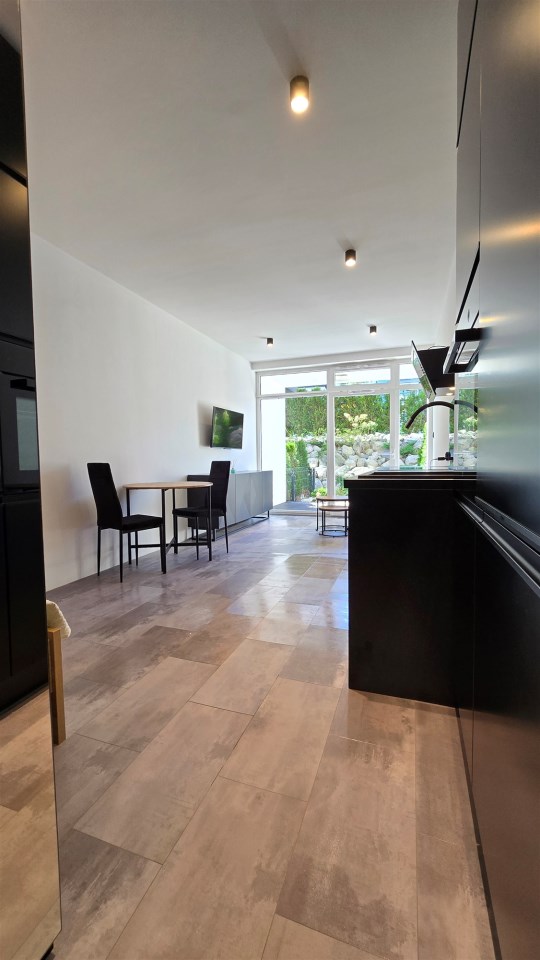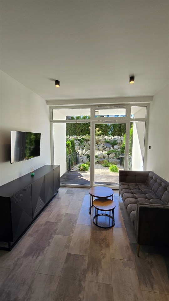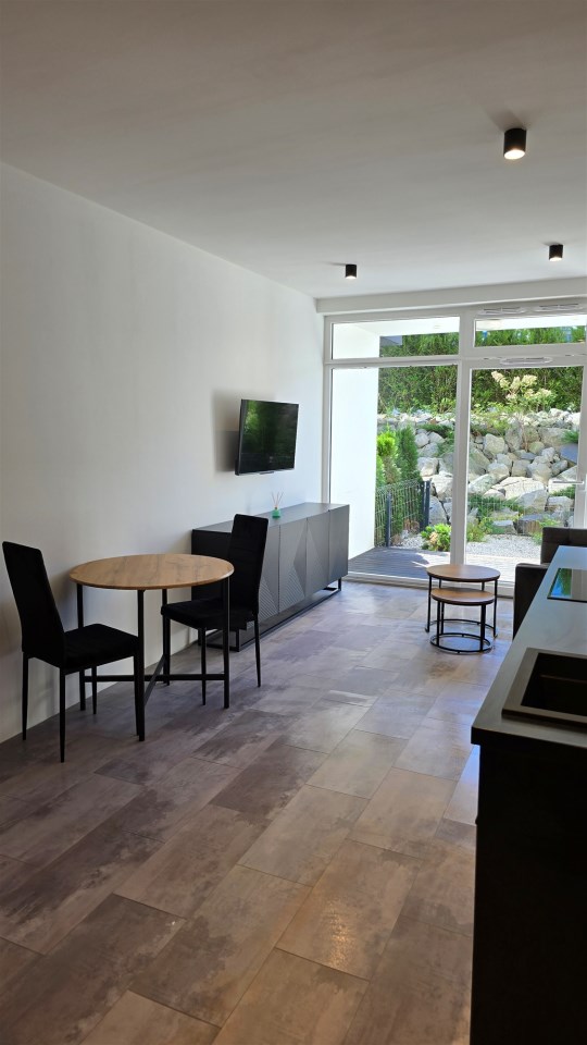 Przestrzeń otwarta, nowoczesna, z dużymi oknami prowadzącymi na ogródek. Jasne wnętrze sprzyja wypoczynkowi, pracy oraz wygodnemu gotowaniu. Ogródek idealny na poranną kawę lub wieczorny relaks z widokiem na góry.
