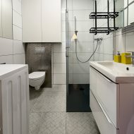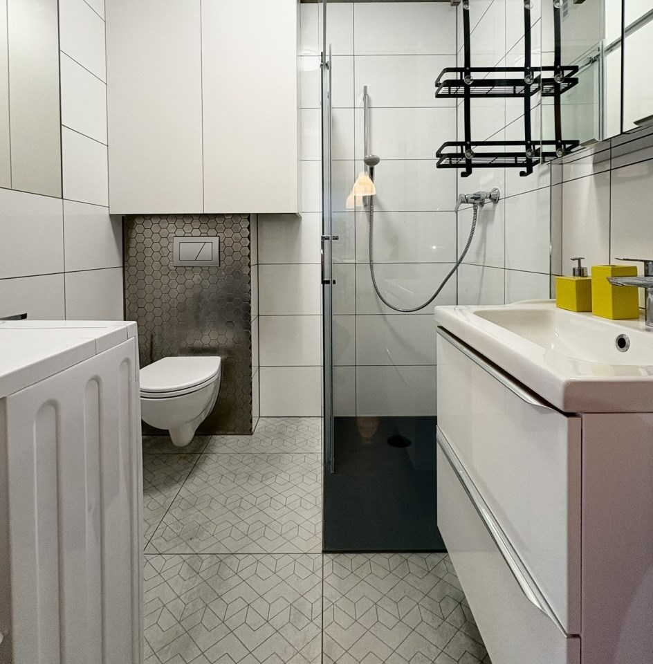 Nowoczesna łazienka z prysznicem i pełnym wyposażeniem.