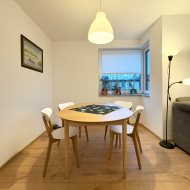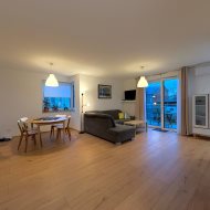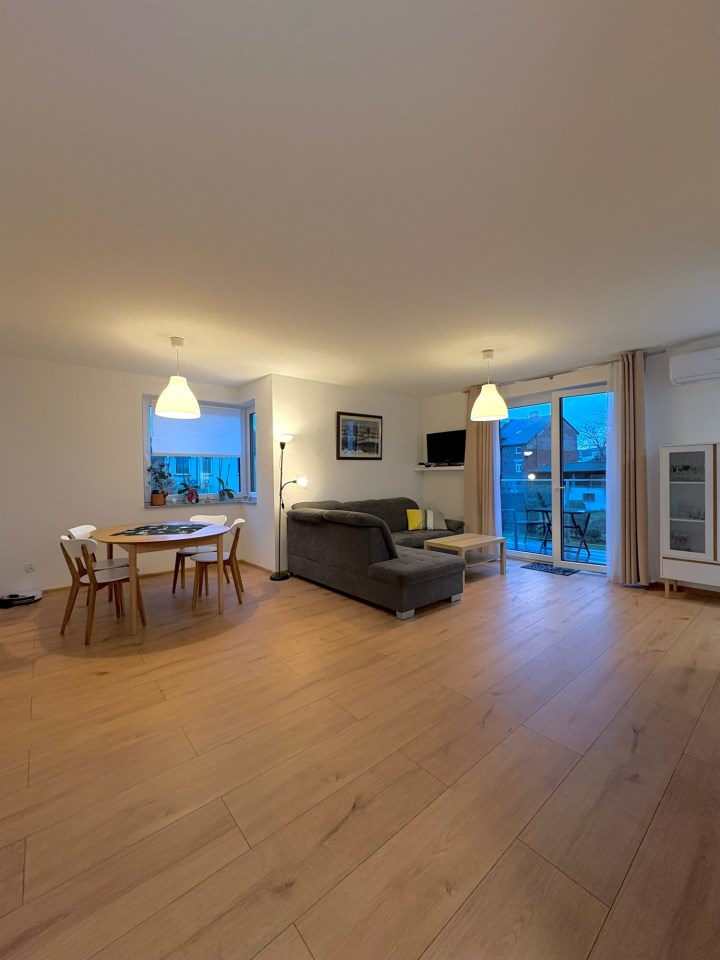 Przestronny salon z aneksem kuchennym i jadalnią – jasne, otwarte wnętrze z dużymi oknami i wyjściem na duży balkon, który świetnie sprawdzi się na poranną kawę lub relaks po pracy.