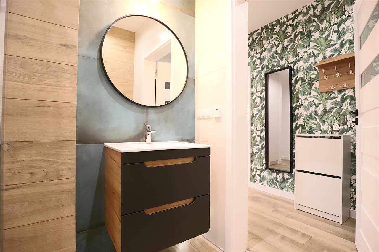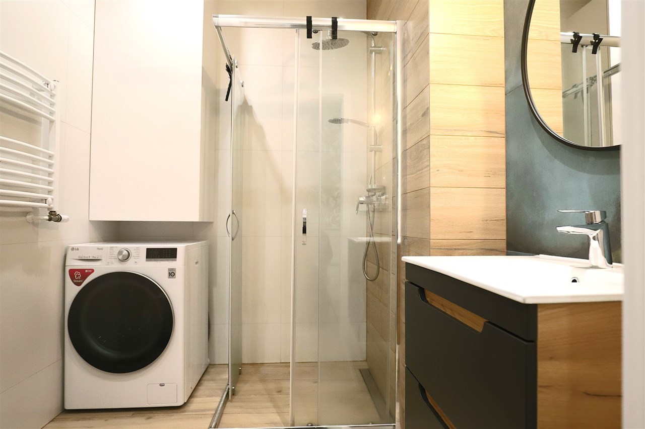 | Wyposażenie łazienki | umywalka, WC, prysznic, lustro, pralka, kabina prysznicowa |